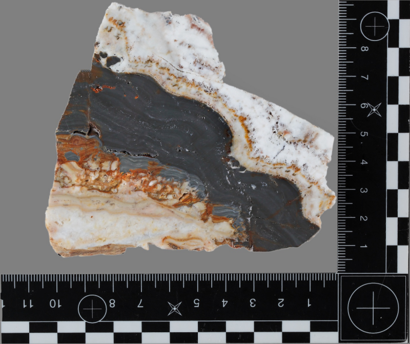 Figure 2: Hand sample of mineralization with typical rhythmic banding. The black area is composed of very fine-grained pyrite. This sample was found as float on the site and will be sent in for assay.