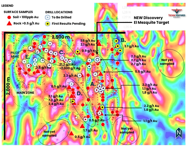 El Mezquite Target – A 350-meter-long soil anomaly with rock samples returning up to 2.7 g/t Au and 24 g/t Ag, aligned with a prominent north-south magnetic linear feature interpreted as a controlling fault structure. A drill rig is currently following up on the target.