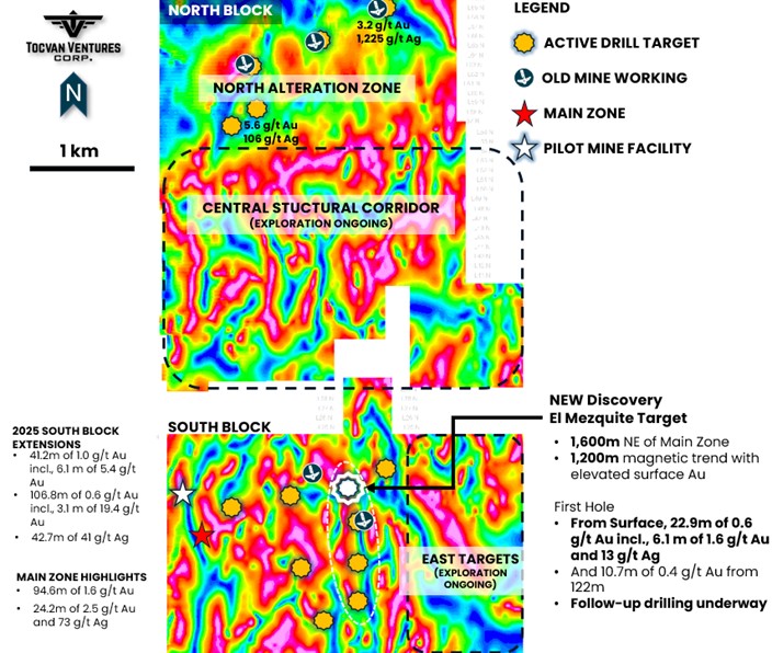 South Block New Gold-Silver Zone – Located 1,600 meters northeast of the Main Zone, where the first aggressive step-out hole (JES-26-135) recently intersected 22.9 m of 0.6 g/t Au (including 6.1 m of 1.6 g/t Au and 13 g/t Ag) from surface within a 1,200-meter-long magnetic anomaly surrounded by strongly anomalous gold-in-soil and rock samples. (April 1, 2026 News Release)