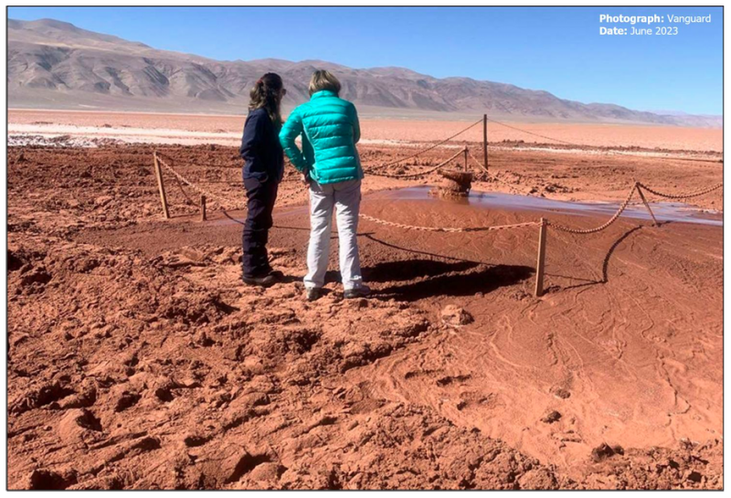 Figure 2: Vanguard geologists examining brine, and mud flow over the concrete platform June 2023 [Panopus, 2023]