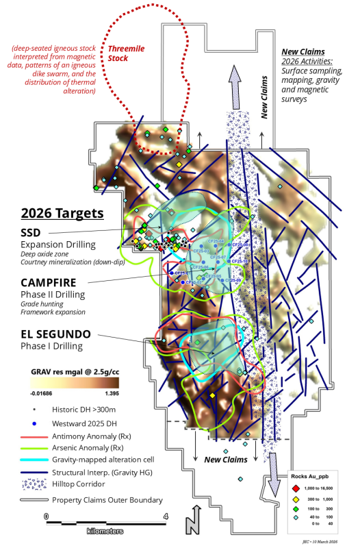 SSD was originally identified several years ago by the Company through a detailed investigation of legacy drill hole data; it is a separate and unique zone of gold mineralization that lies beneath the Courtney Zone, an area of shallow gold mineralization that was the focal point of the vast majority of historical drilling by previous operators. Westward subsequently expanded upon SSD with drilling in 2022 and 2023, and now with the benefit of large-scale systematic programs completed since then – including 1:5000 surface mapping, relogging of legacy RC and core drill holes, soil and rock-chip sampling, gravity and magnetic surveys – this target has been deemed a top priority for follow-up in 2026. SSD also represents the target zone that is most proximal to the recently-identified Threemile Stock, a deep-seated intrusive centre interpreted from magnetic data, dike swarms, and mapped/logged thermal alteration (see press release dated March 26, 2026, for additional details). Importantly, SSD earthwork is already permitted under the Company’s existing Exploration Plan of Operations (“EPO”) with the U.S. Bureau of Land Management (“BLM”), allowing for significant trench, road, and drill-pad construction flexibility – additional permitting updates for the entire 2026 drill program are outlined below. Details related to 2026 drilling plans at the other two target areas (Campfire and El Segundo) will be provided in subsequent press releases (see Figure 1 below).