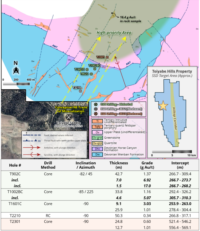 Significant gold intervals reported in historical SSD drilling ranged from 9.1 to 50.3 metres thick at depths of 255 to 570 metres (see Figure 2 below), with notable intervals grading between 0.34 and 3.03 g Au/t (and sub-interval grades of up to 17.0 g Au/t). Mineralization remains open in all directions, particularly to the northeast and northwest which will be a focus for 2026 trench sampling, surface mapping, and drilling.