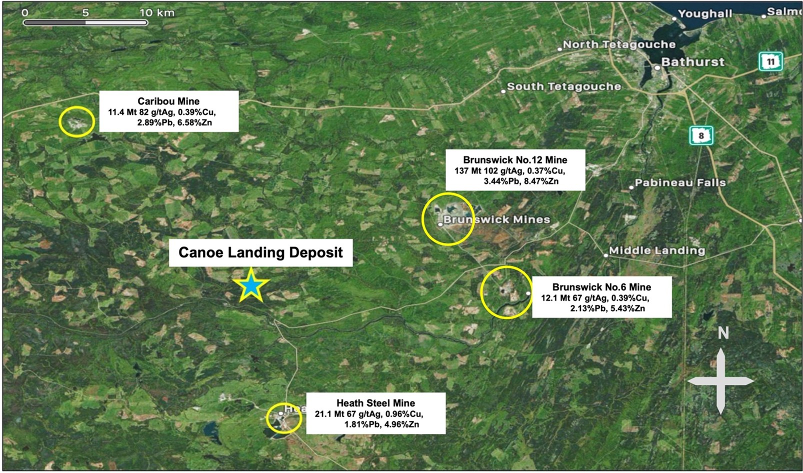 Figure 1. Bathurst Mining Camp, Historical VMS Mine Production and Location of Canoe Landing Deposit